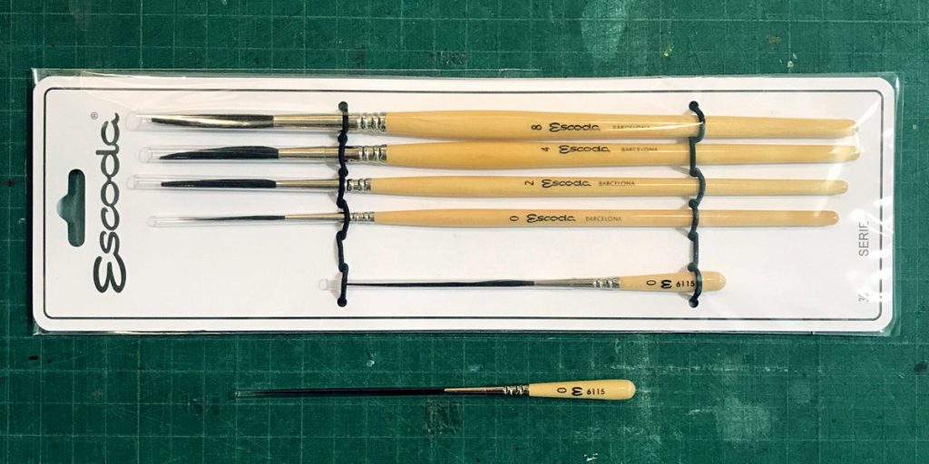 Set de pinceles de fileteado de pelo natural, marca Escoda nº 0, 2, 4, 8 + banda nº 0, con virola cromada.